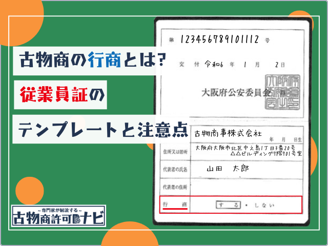 古物商の従業員が営業所以外で行商を行う場合、「行商従業者証」を携帯することが古物営業法で義務付けられています。