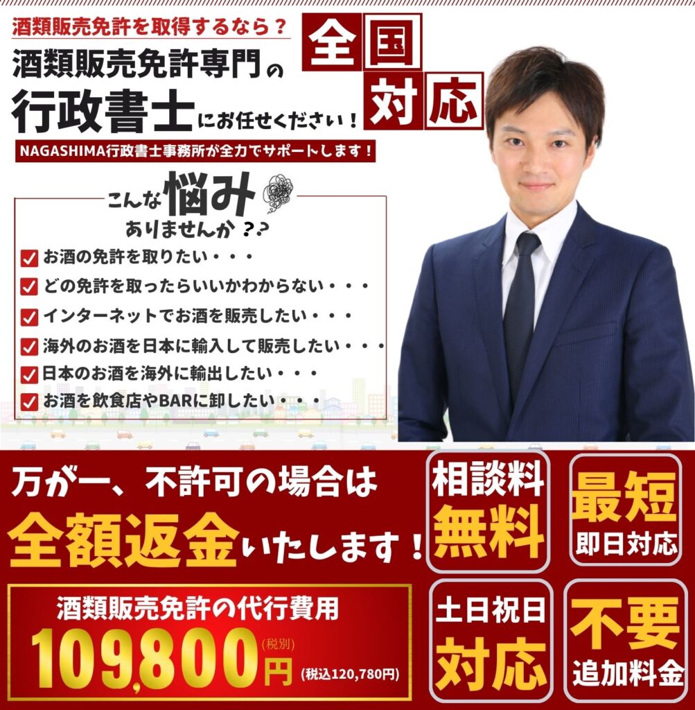 詳しい費用の内訳や行政書士の代行費用の相場については「酒類販売免許の取得費用は?|個人・法人別や行政書士の代行料金の平均相場」をご確認ください。