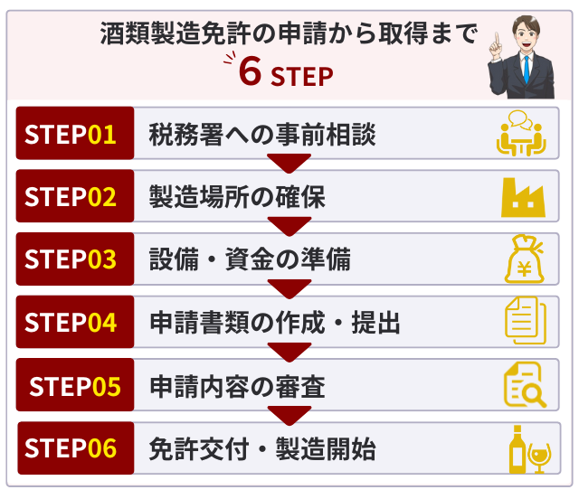 ここでは、申請を検討し始めてから免許が交付されるまでの流れを、6つのステップに分けて解説します。